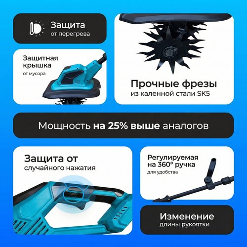 Больше никакой возни с топливом, масляными пятнами и шумными двигателями! Аккумуляторный культиватор — это современное решение для тех, кто ценит своё время, здоровье и экологию.